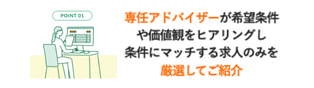 あなたの希望条件や経歴を細かくすり合わせ、その内容にマッチした求人のみを厳選して紹介してくれます。