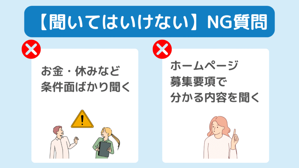 業務内容について聞かず、最初からお金や休みについて質問するのは絶対にNG